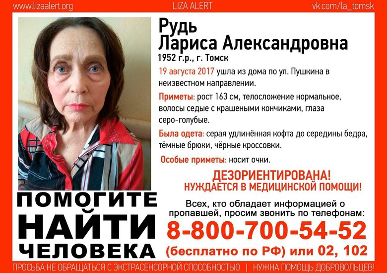 «Лариса Рудь была найдена 23 августа, сейчас с ней все в порядке», — сказала наша собеседница. При этом обстоятельства обнаружения пропавшей в «Лизе Алерт» не разглашают.