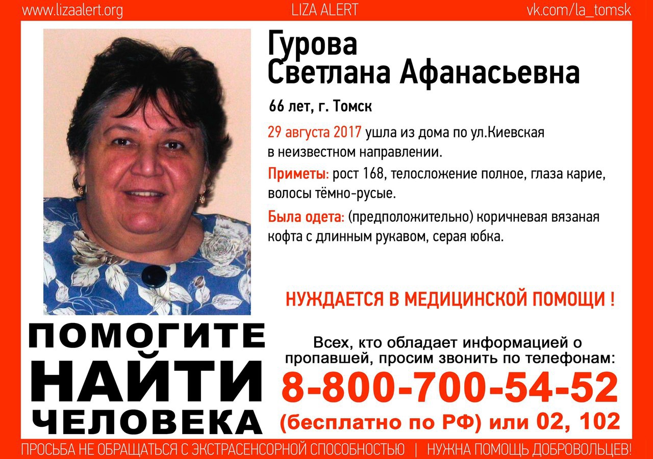 «Внимание! Пропал человек! Гурова Светлана Афанасьевна, 66 лет. 29 августа около 20:00 ушла из дома по улице Киевской в неизвестном направлении», — говорится в сообщении.