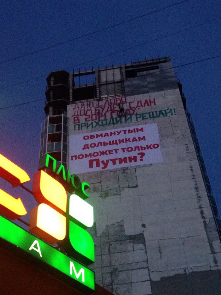 Как видно на фотографии, на фасаде дома краской написано «Даю слово, дом будет сдан в 2014 году», а ниже — «Приходи и решай!». Ниже на отдельно висящем баннере напечатан вопрос: «Обманутым дольщикам поможет только Путин?» Пользователь социальных сетей отмечают, что надпись на доме видно с площади Южной.