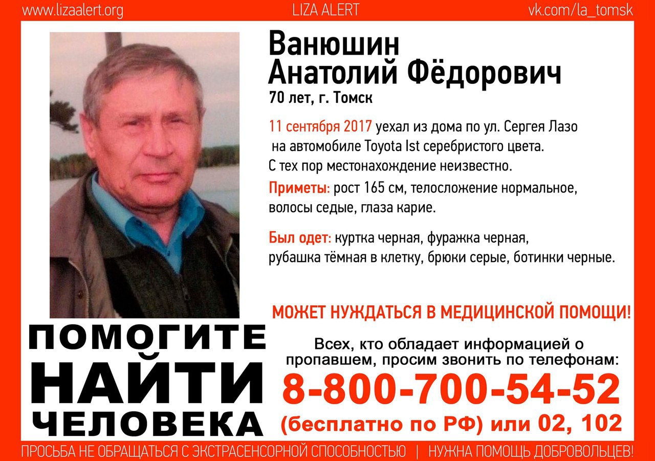 «Внимание! Пропал человек! Ванюшин Анатолий Федорович, 70 лет. 11 сентября около 14:00 уехал из дома на улице Лазо на автомобиле Toyota Ist серебристого цвета. В настоящее время местонахождение неизвестно», — говорится в сообщении.
