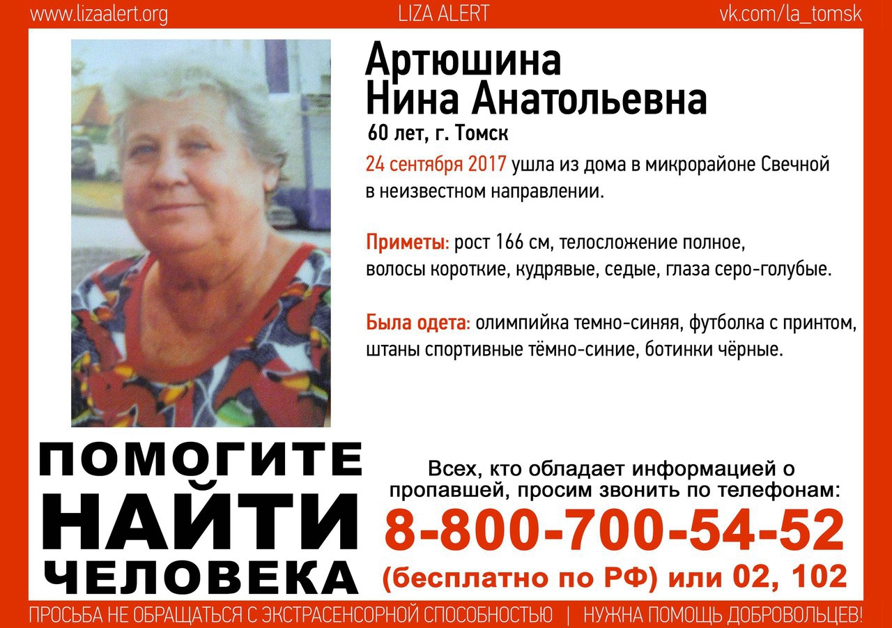 «Внимание! Помогите найти человека! Артюшина Нина Анатольевна, 60 лет. 24 сентября 2017 ушла из дома в микрорайоне Свечной в неизвестном направлении», — говорится в сообщении.