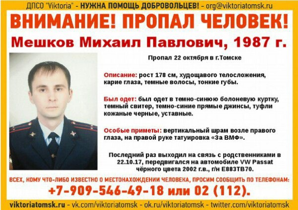Михаил Павлович Мешков 1987 года рождения последний раз выходил на связь с родственниками 22 октября, передвигался на черном автомобиле Volkswagen Passat.