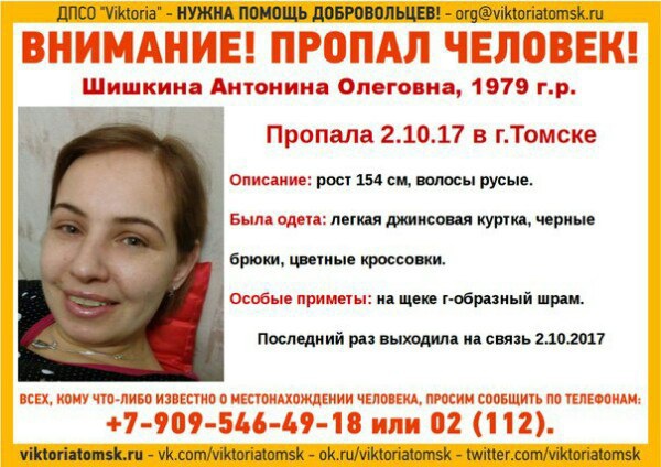 Томичка Антонина Олеговна Шишкина 1979 года рождения последний раз выходила на связь 2 октября.
