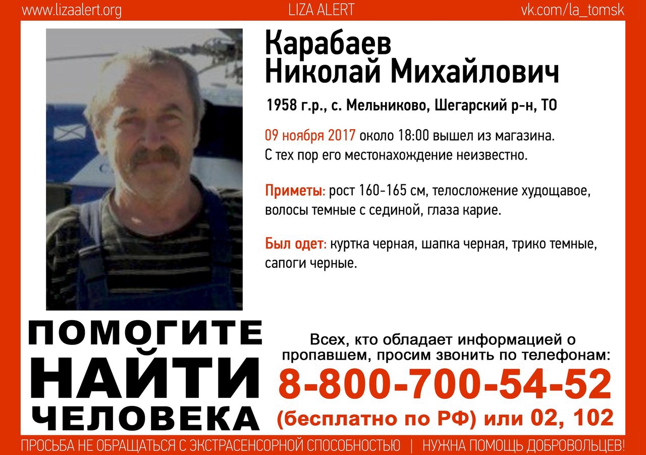 «Помогите найти человека! Карабаев Николай Михайлович, 1958 года рождения. 9 ноября около 18:00 вышел из магазина в селе Мельниково Шегарского района. С тех пор его местонахождение неизвестно», — говорится в сообщении.