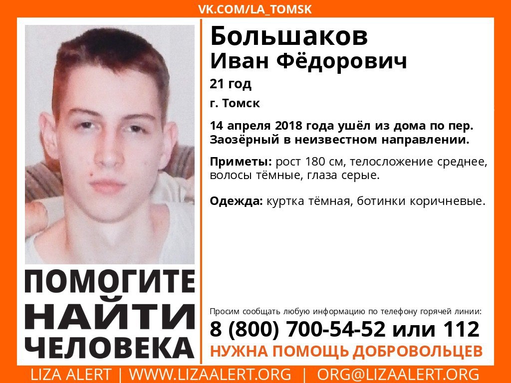 «Томск, внимание. Помогите найти человека. Пропал Большаков Иван Федорович, 21 год, город Томск. 14 апреля 2018 года ушел из дома по переулку Заозерному в неизвестном направлении», — говорится в сообщении.