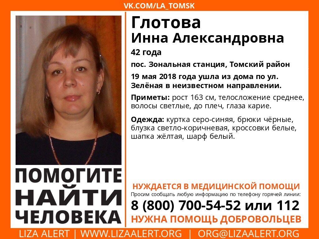 По данным поискового отряда «Лиза Алерт», Инна Глотова 19 мая ушла из дома по улице Зеленой поселка Зональная станция в неизвестном направлении.