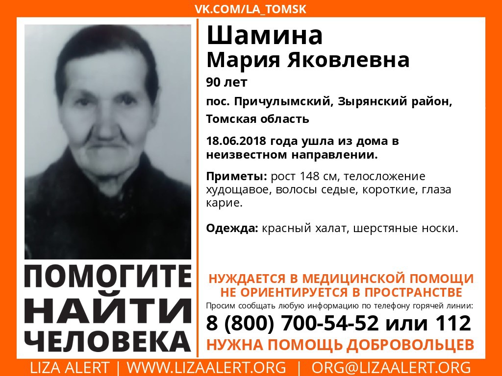 Как в свою очередь сообщает отряд «Лиза Алерт», пропавшая — Мария Шамина — имеет рост 148 сантиметров, худощавое телосложение, седые волосы, карие глаза. Была одета в красный халат и шерстяные носки.