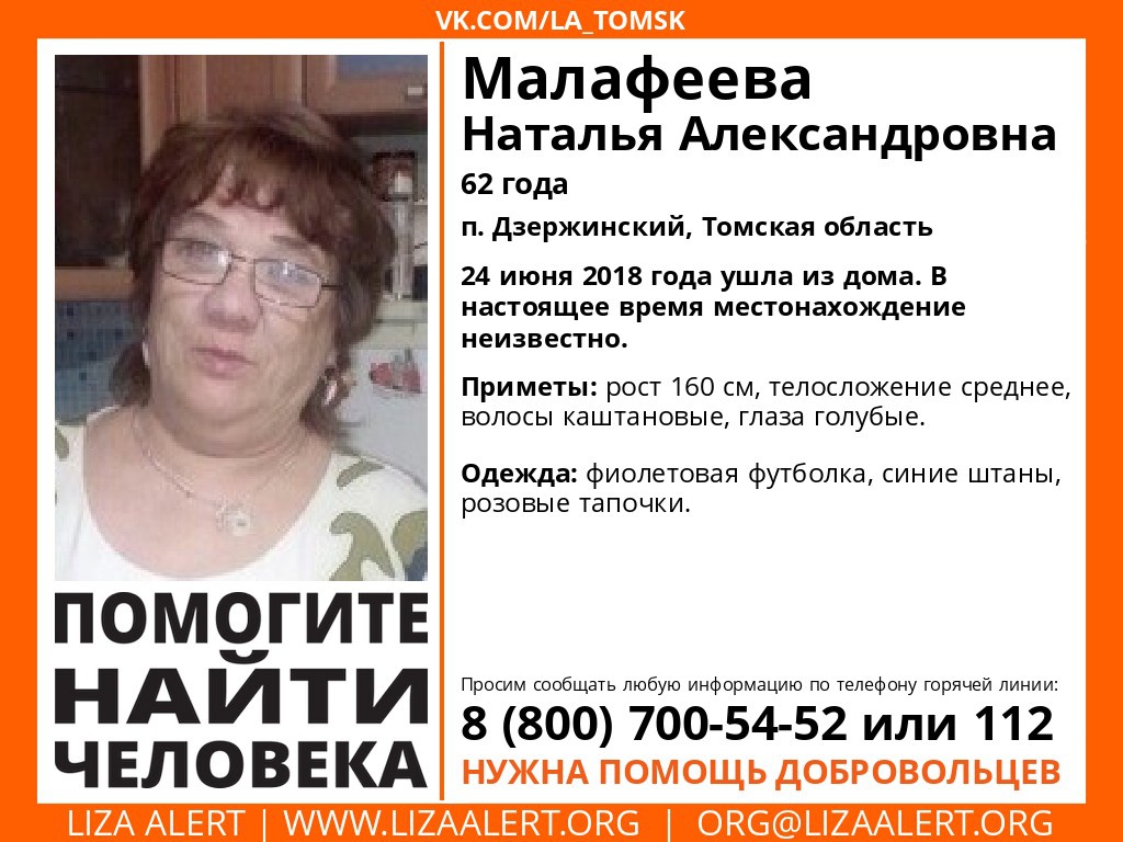 «Томск. Внимание. Малафеева Наталья Александровна, 62 года. 24 июня 2018 года ушла из дома в поселке Дзержинское Томского района.