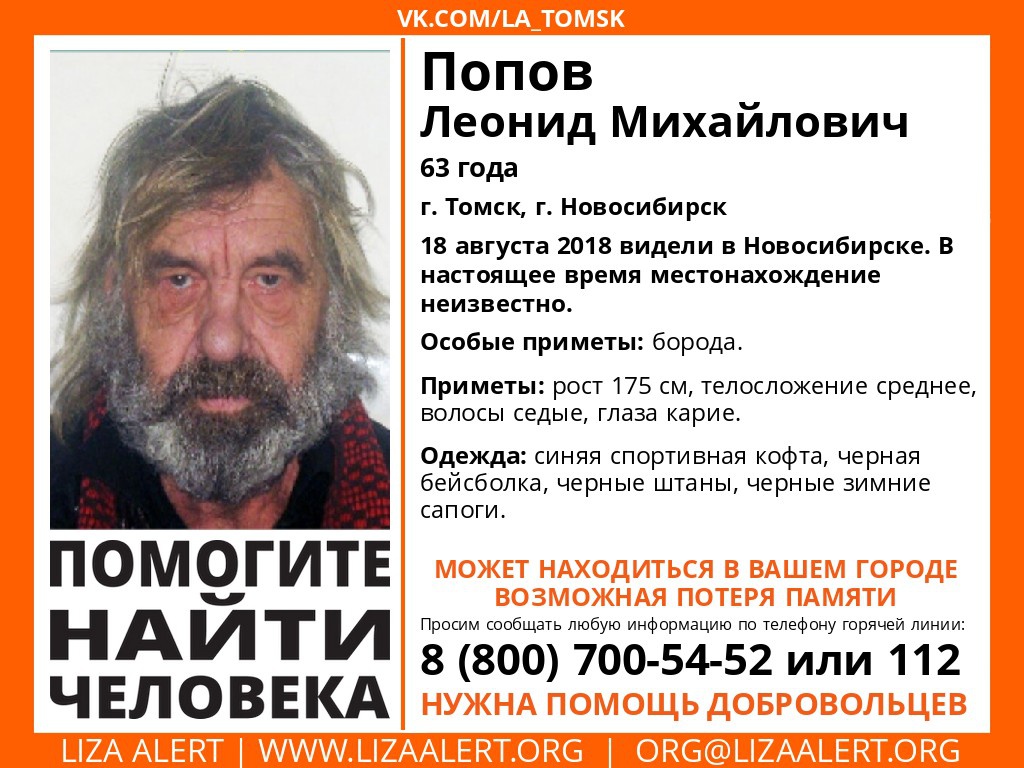 «Новосибирск, Томск, внимание. Помогите найти человека. Пропал Попов Леонид Михайлович, 63 года. 18 августа последний раз видели в городе Новосибирск. В настоящее время местонахождение неизвестно. <...> Может находиться в Томске, возможна потеря памяти», — говорится в сообщении.