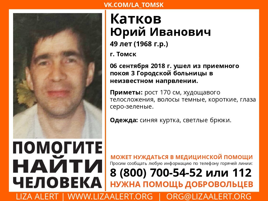 «Томск, внимание. Помогите найти человека. Пропал Катков Юрий Иванович, 49 лет. 6 сентября 2018 года ушел из приемного покоя городской больницы № 3 в неизвестном направлении. Дальнейшее местонахождение неизвестно», — сообщается в группе поисково-спасательного отряда «Лиза Алерт» во «ВКонтакте».