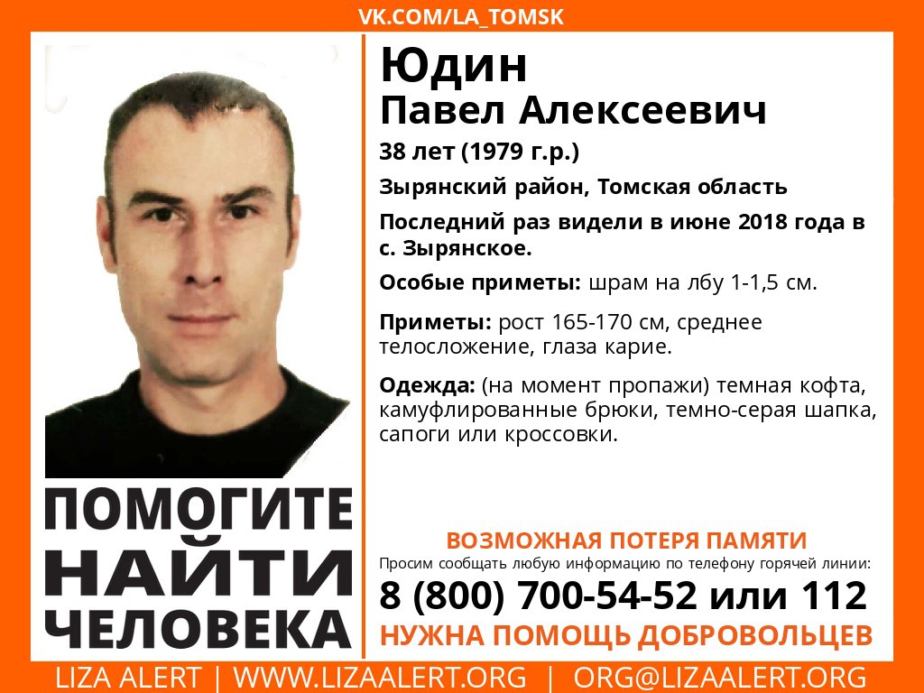 Житель Зырянского района Павел Юдин пропал в октябре 2017 года, поиски мужчины по-прежнему ведутся. Пока его местонахождение установить не удалось, однако один из жителей села Зырянского видел Павла Юдина в июне 2018-го.