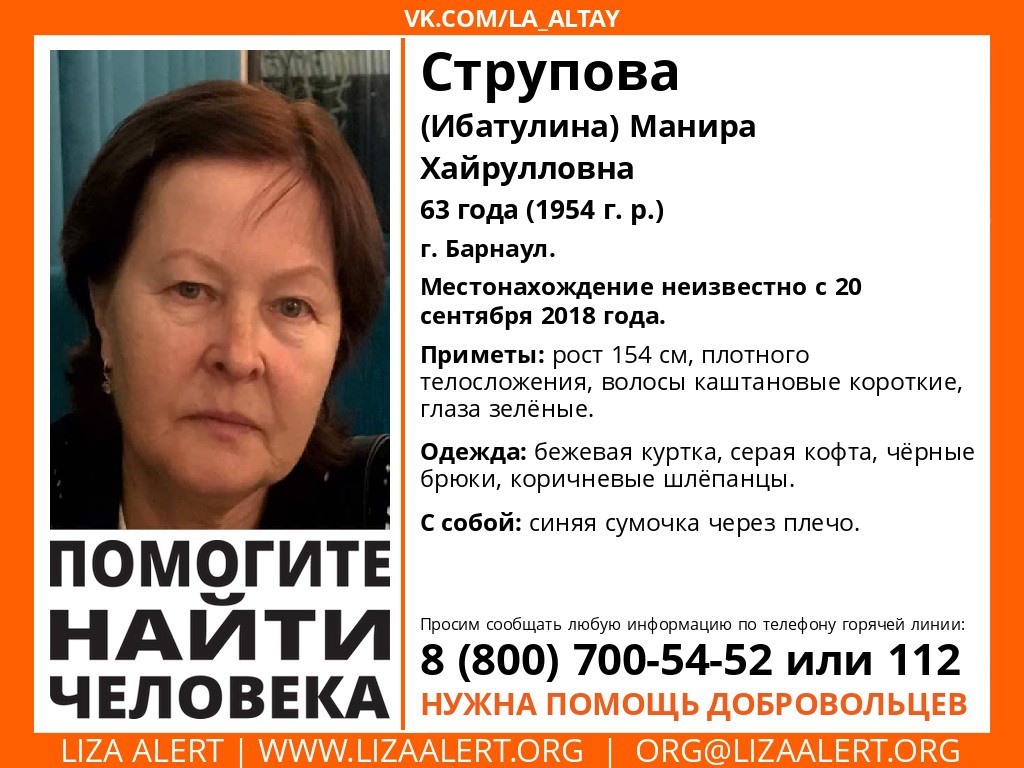 «Пропала Струпова Манира Хайрулловна, 63 года, город Барнаул. Местонахождение неизвестно с 20 сентября. Может направляться в город Томск или в Бишкек, Республика Кыргызстан», — сообщается в группе поисково-спасательного отряда «Лиза Алерт» во «ВКонтакте».