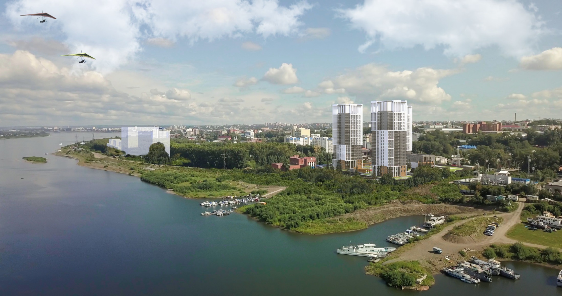 «Строительство данного комплекса является первой очередью в развитии проекта «Томские набережные». Комплекс будет располагаться на пересечении улицы Учебной и Московского тракта, на въезде в Томск со стороны коммунального моста. Проектируемый жилой комплекс состоит из трех вертикальных акцентов — три башни высотой в 24 и 25 этажей. На территории комплекса размещена подземная парковка, со стороны Московского тракта — общественно-административный блок, на первом этаже которого располагаются элементы обслуживания, на втором — фитнес-залы. Здесь развивается идея города без автомобилей, все они будут размещены в подземном уровне или за пределами жилой части», — сообщил в ходе II Съезда строителей и проектировщиков руководитель архитектурного бюро «Стиль» Сергей Худяков.