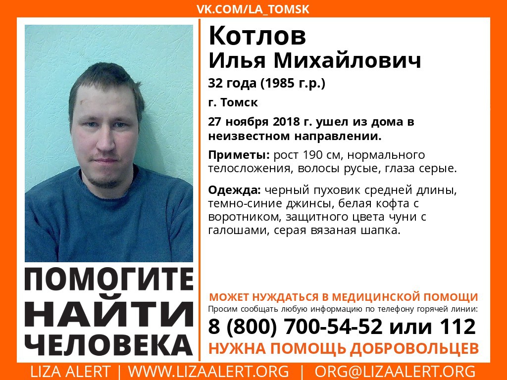 «Томск, внимание! Помогите найти человека: пропал Котлов Илья Михайлович, 32 года. Днем 27 ноября 2018 ушел из дома в неизвестном направлении», — сообщили в поисково-спасательном отряде «Лиза Алерт Томск».