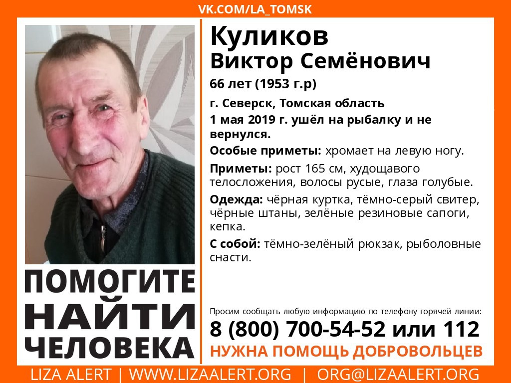 Жителей Томской области просят помочь с поисками пропавшего 66-летнего Виктора Куликова. 1 мая он отправился на рыбалку. С тех пор о его местоположение ничего неизвестно, сообщает поисково-спасательный отряд «Лиза Алерт Томск».