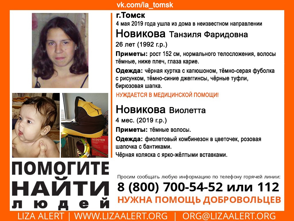 Как сообщают поисковики, пропала Танзиля Новикова 1992 года рождения и ее дочь 2019 года рождения. Девушка ушла вместе с ребенком из дома в неизвестном направлении 4 мая. «Нуждается в медицинской помощи», — пишет «Лиза Алерт».