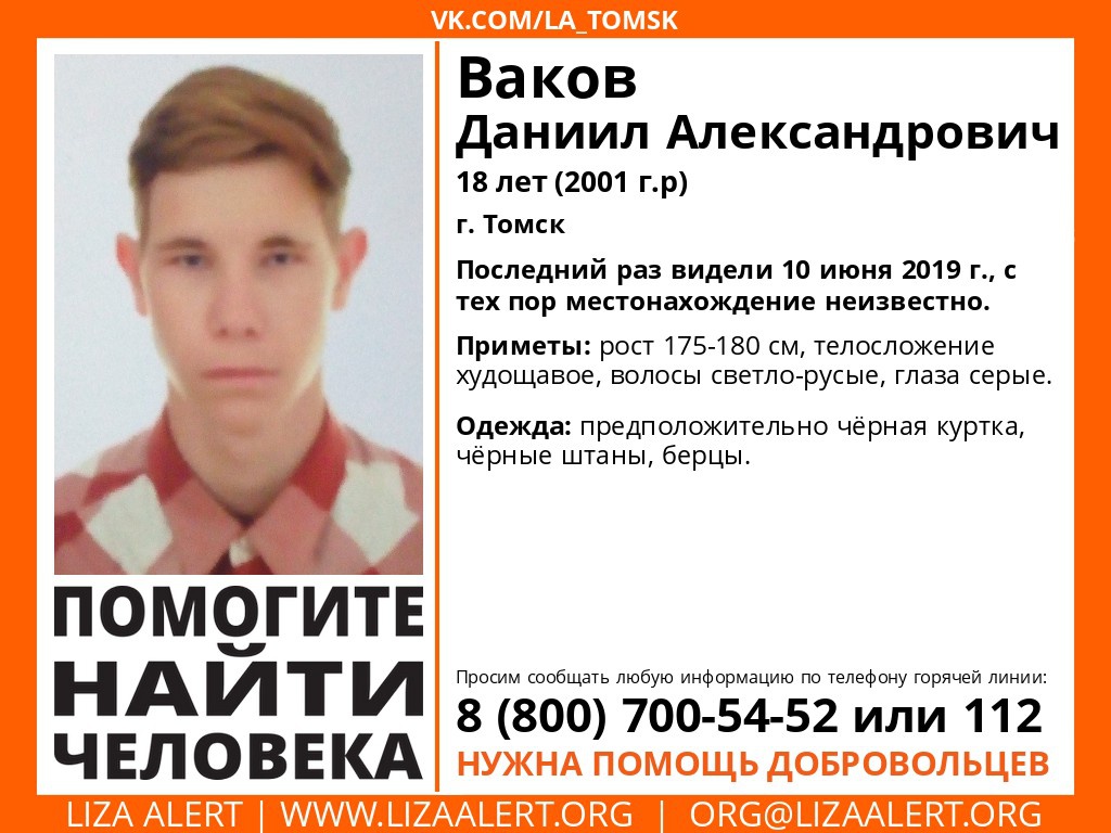 «Пропал Ваков Даниил Александрович, 18 лет, город Томск. С 10 июня 2019 года местонахождение неизвестно», говорится в сообщении.