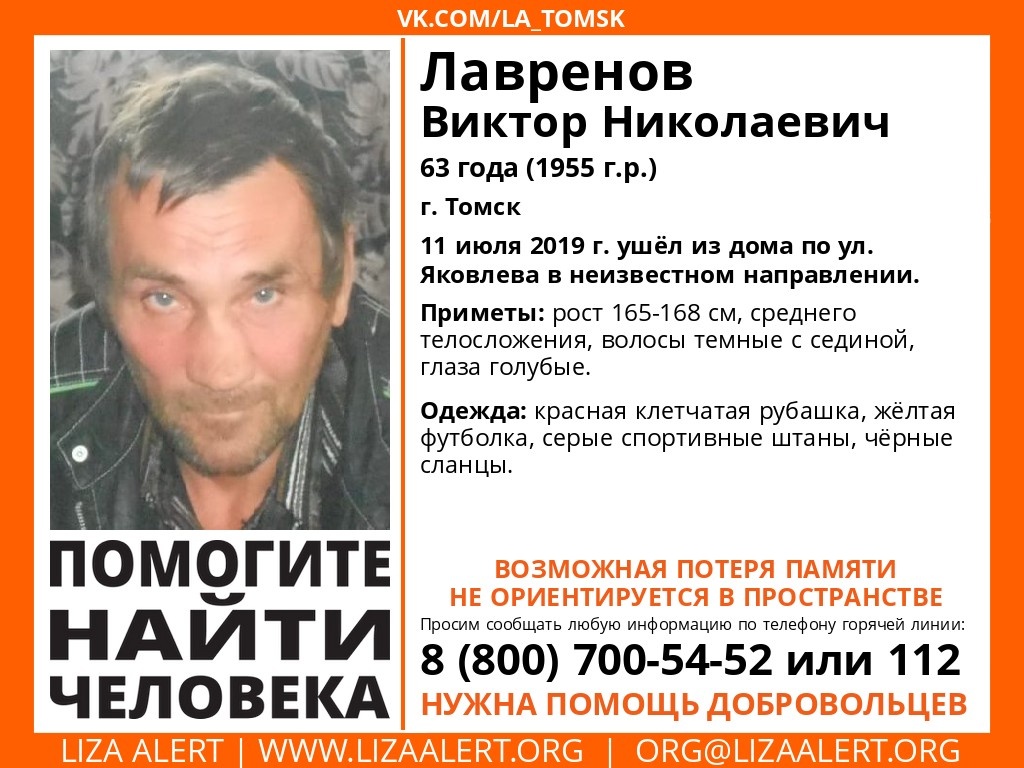 «Помогите найти человека. Пропал Лавренов Виктор Николаевич, 63 года, Томск. 11 июля ушел из дома по улице Яковлева в неизвестном направлении», — сообщается в группе поисково-спасательного отряда «Лиза Алерт Томск» в соцсети «ВКонтакте».