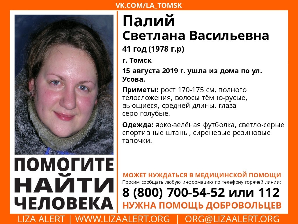 «Томск, внимание! Помогите найти человека. Пропала Палий Светлана Васильевна, 41 год. 15 августа 2019 года ушла из дома по улице Усова. Может нуждаться в медицинской помощи», — говорится в группе «Лизы Алерт» во «ВКонтакте».