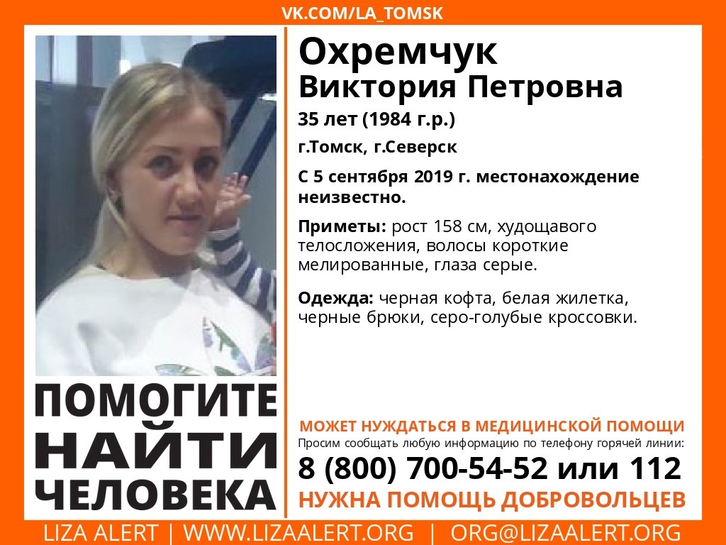 Виктории Охремчук 35 лет. С 5 сентября о ее местонахождении ничего неизвестно. Волонтеры утверждают, что она может находиться в Томске или в Северске.
