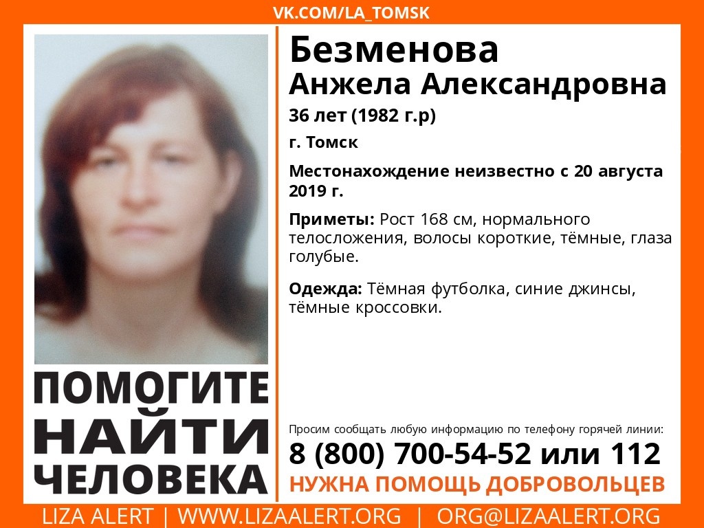 «Томск, внимание! Помогите найти человека. Пропала Безменова Анжела Александровна, 36 лет. Местонахождение неизвестно с 20 августа 2019 года», —говорится в сообщении.