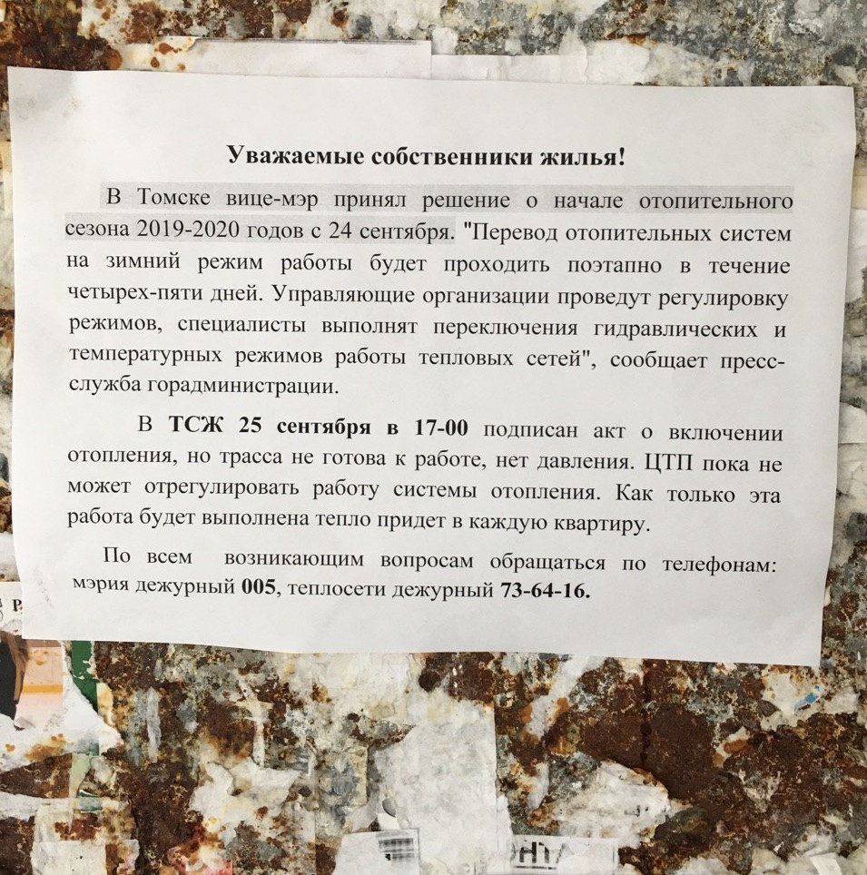 Распоряжение о подаче тепла в жилые дома Томска в мэрии подписали 24 сентября. Ожидалось, что к 28 числу тепло появится во всех домах города, однако в 11 % многоквартирников батареи по-прежнему холодные. Также в ряде домов нет до сих пор и горячей воды.