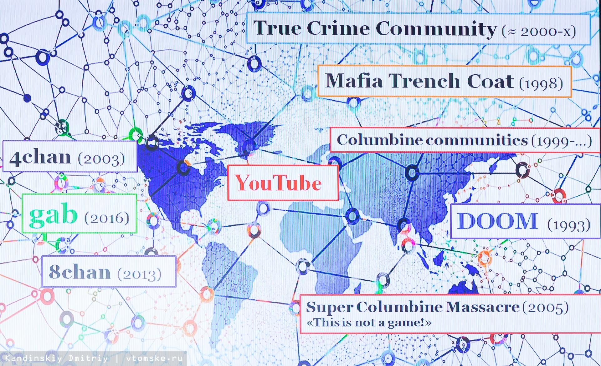 Следом со своим докладом выступила руководитель экспертного совета при антитеррористическом комиссии администрации Томской области Анна Карпова. Ее основная часть доклада была о последователях «Колумбайна» (в 1999 году в американской школе «Колумбайн» двое подростков расстреляли 13 человек, ранили более 20 и застрелили себя. Подростки со всего мира, причисляющие себя к движению «колумбайнеров», пытаются подражать им, совершая подобные убийства — прим. ред.).
