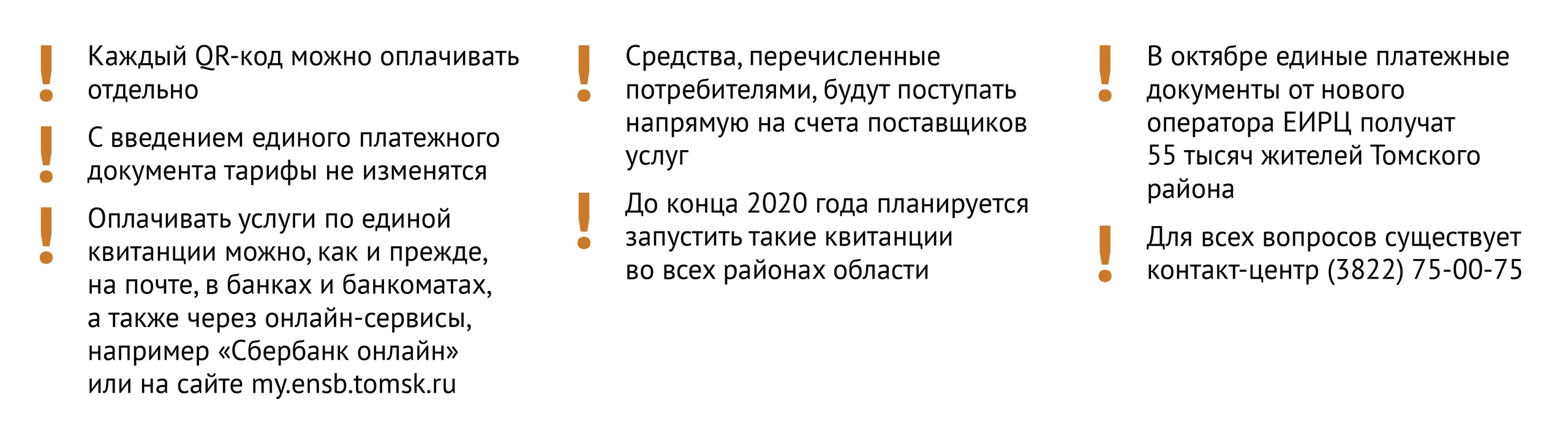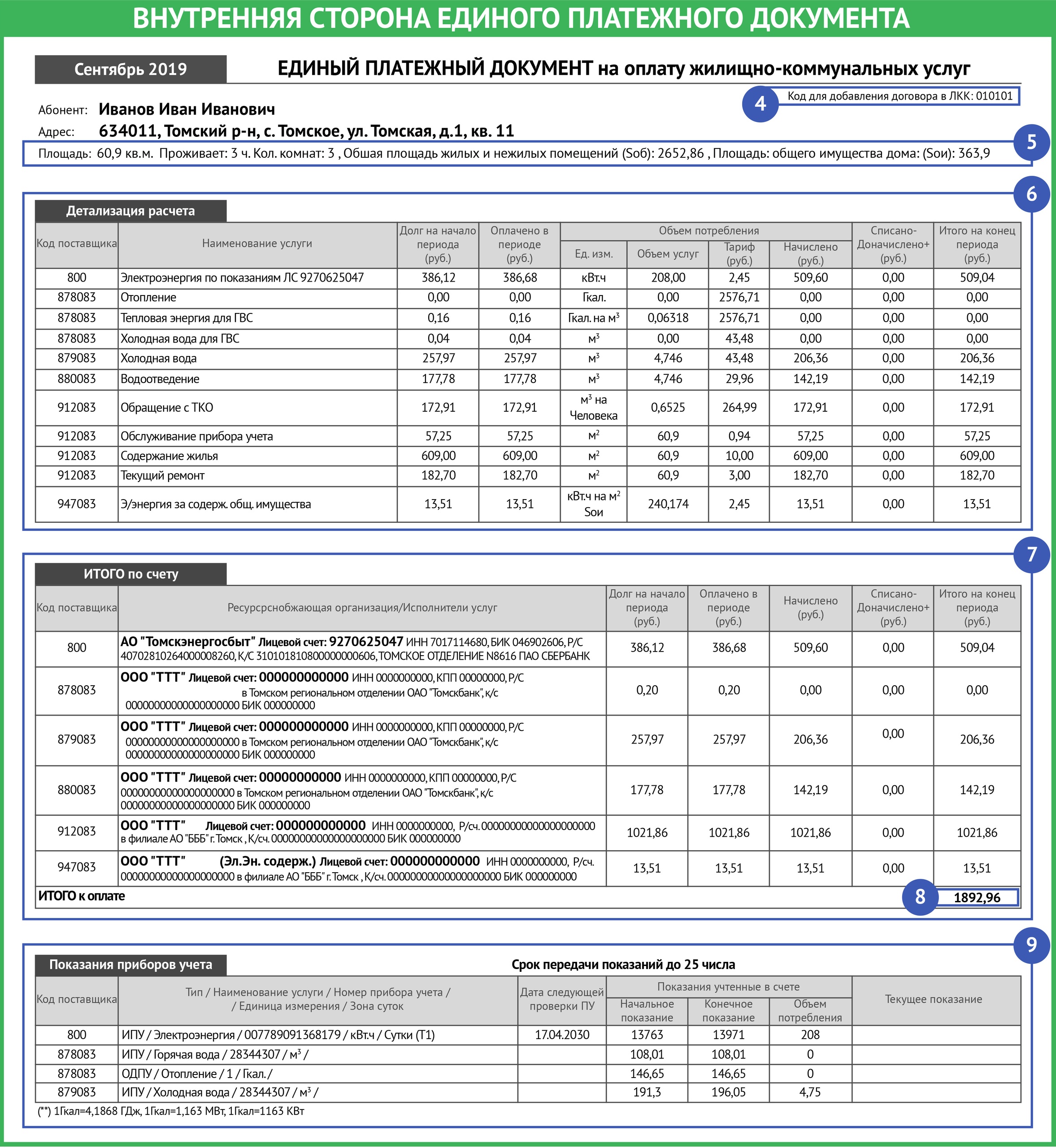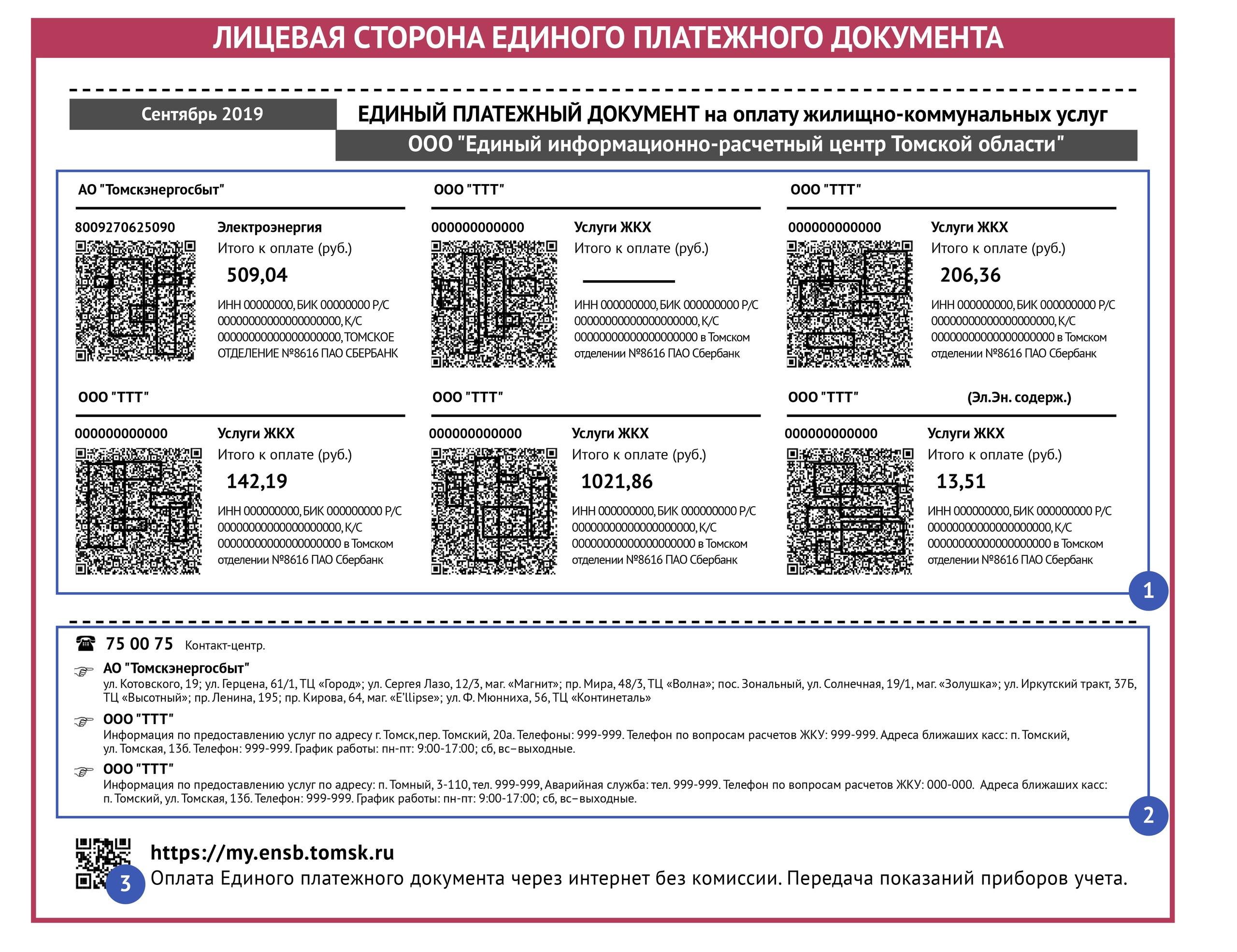 Единая квитанция разработана специалистами ЕИРЦ (дочернее предприятие «Томскэнергосбыта»). Она объединяет все платежи за жилищно-коммунальные услуги. В документе отражаются начисления за электроэнергию, тепло, холодное и горячее водоснабжение, водоотведение, вывоз мусора, капремонт и другие коммунальные услуги.