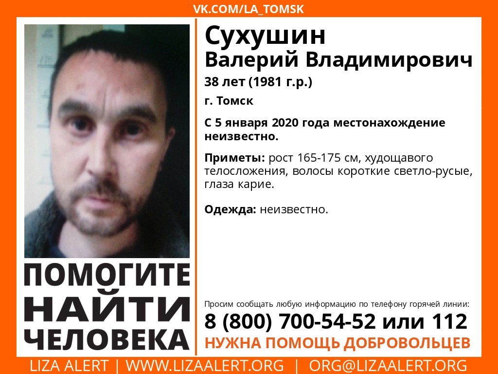 «Томск внимание! Помогите найти человека! Пропал Сухушин Валерий Владимирович, 38 лет, Томск. С 5 января 2020 года нет информации о его местонахождении», — говорится в сообщении.