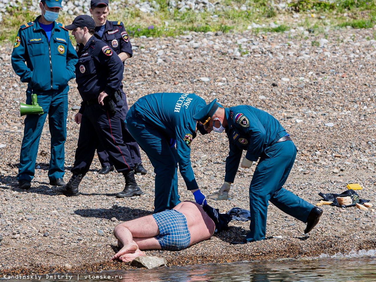 Во время нашего совместного рейда мы стали свидетелями, как сотрудники МЧС и полиции помогали мужчине, который отдыхал на правом берегу Томи. Томич долгое время лежал на солнце без сознания и, возможно, получил тепловой удар. Ему вызвали скорую помощь. Сотрудники, которые ему помогали, сказали, что, скорее всего, мужчина был нетрезв.