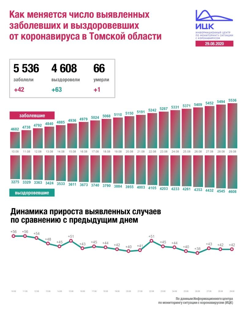 За день количество заболевших в Томской области увеличилось на 42 случая. Всего в регионе за время пандемии вирус выявили у 5 536 человек