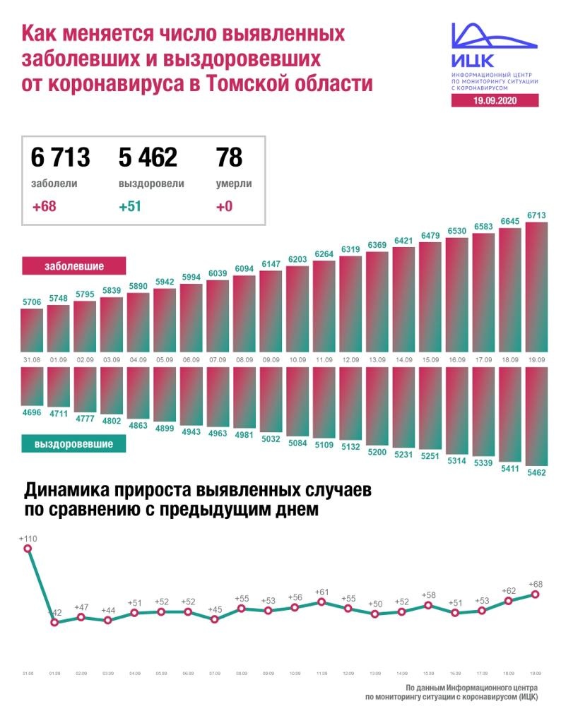 В Томской области за сутки выявили 68 новых случаев заражения инфекцией. В целом в регионе заболели за пандемию 6 713 жителей.