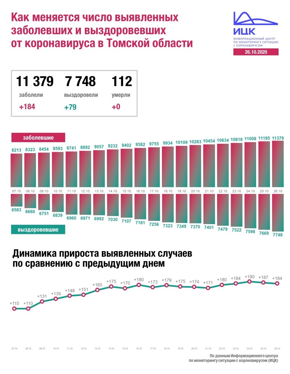В Томской области за сутки подтвердилось 184 новых случая инфекции. По числу выявленных за сутки случаев область находится на 22-м месте среди всех регионов РФ.