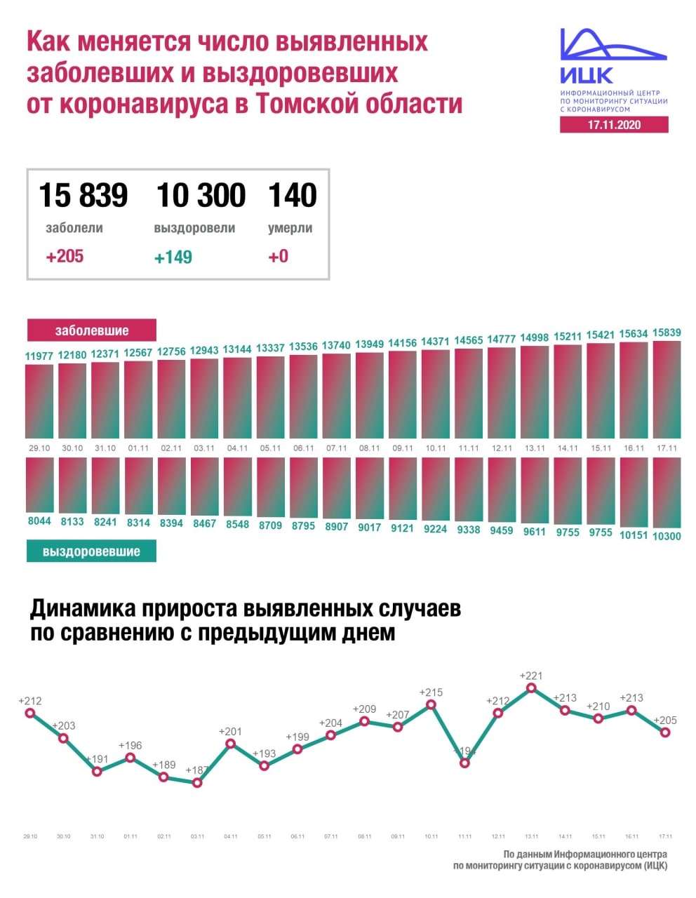 Из общего числа выявленных за сутки в России случаев 205 приходится на Томскую область.