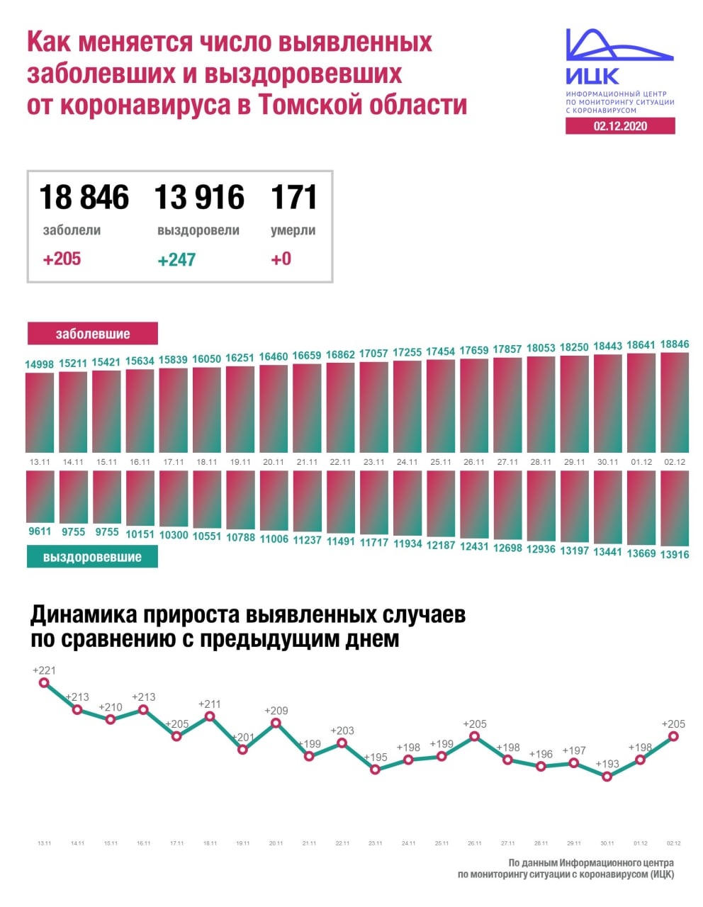 В Томской области за сутки вирус выявлен по результатам тестов у 205 человек. Всего за пандемию заболели в регионе, по официальной статистике, 18 846 человек. При этом в данные не входит Северск, там на 1 декабря выявлено за все время более 4,4 тысячи случаев заражения инфекцией, сообщали в ФМБА.