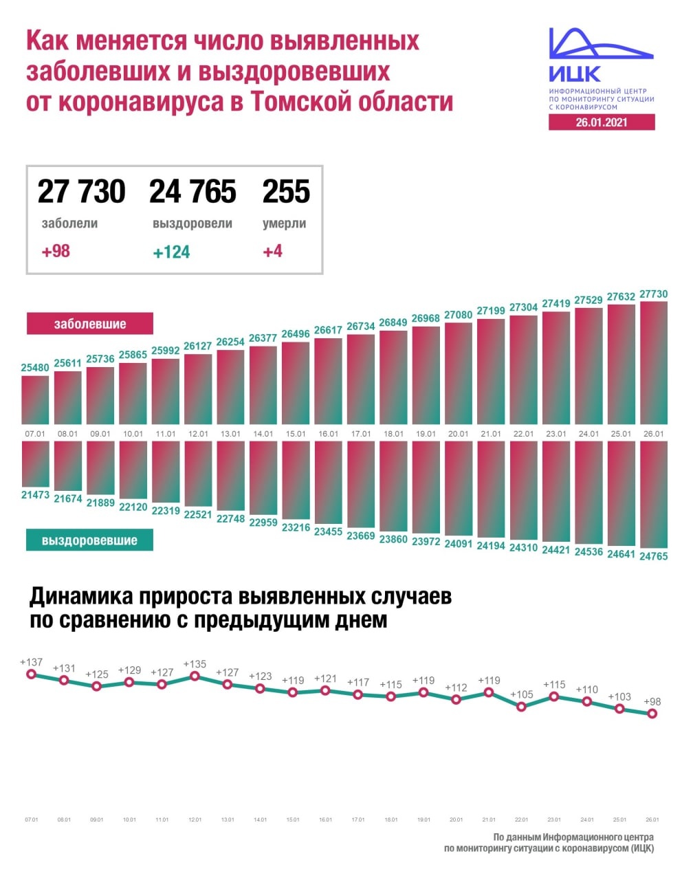 Как сообщает ИЦК, по итогам суток в Томской области подтверждено 98 новых случаев коронавируса — на пять меньше, чем днем ранее. Общее число подтвержденных официально случаев заражения вирусом в регионе составляет 26 января 27 730.