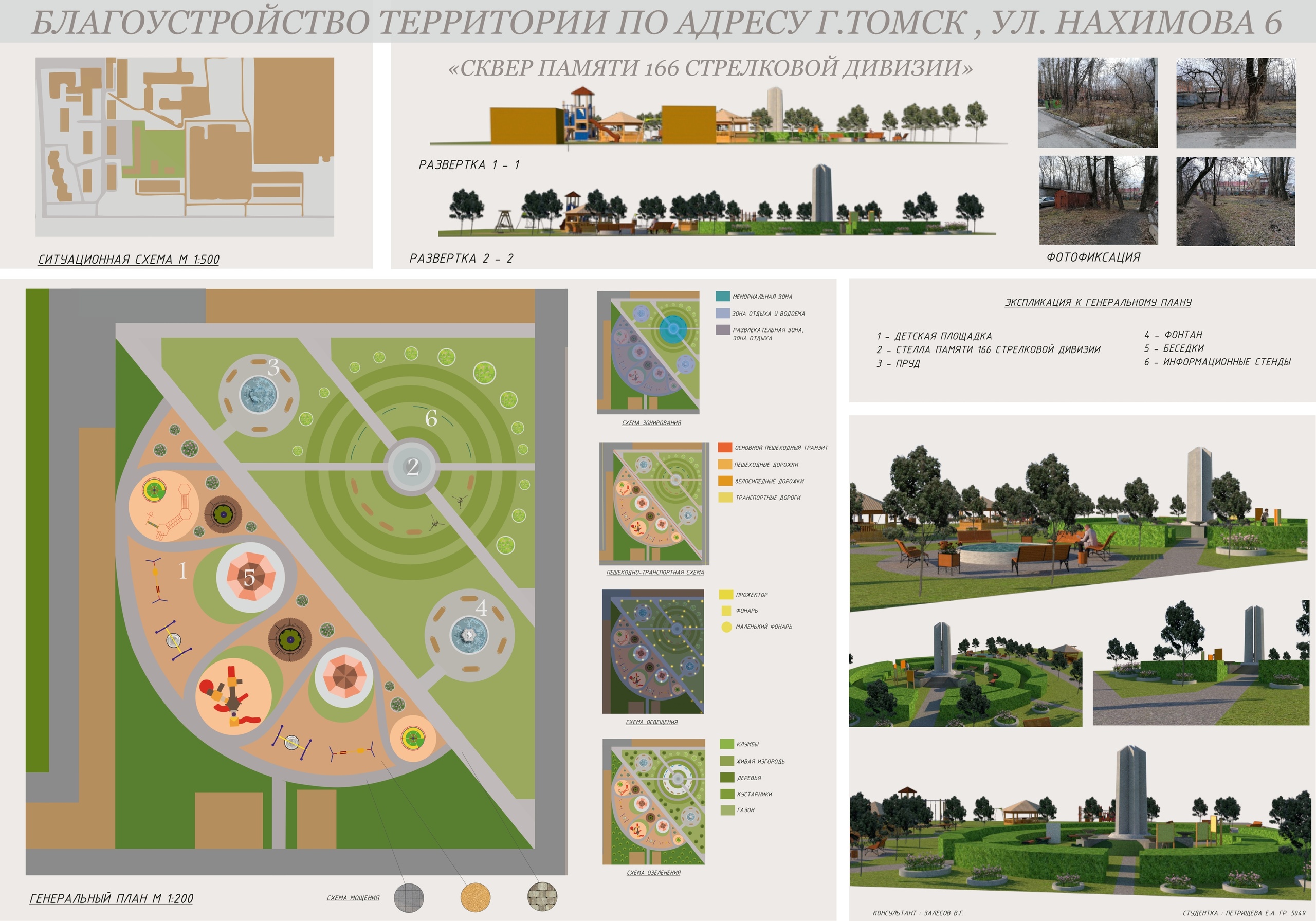 Создание схем будущего сквера администрация Кировского района поручила специалистам ТГАСУ. Студенты кафедры теории и истории архитектуры под руководством заведующего кафедрой Валерия Залесова подготовили четыре проекта сквера.