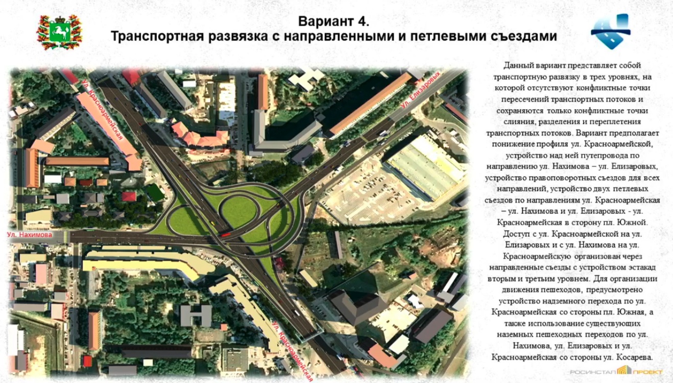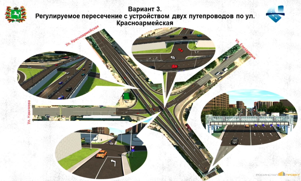 Четвертый вариант — самый дорогостоящий. Это трехуровневая развязка. Вариант предполагает устройство над улицей Красноармейской путепроводов по направлению Нахимова — Елизаровых, устройство правоповоротных съездов для всех направлений.