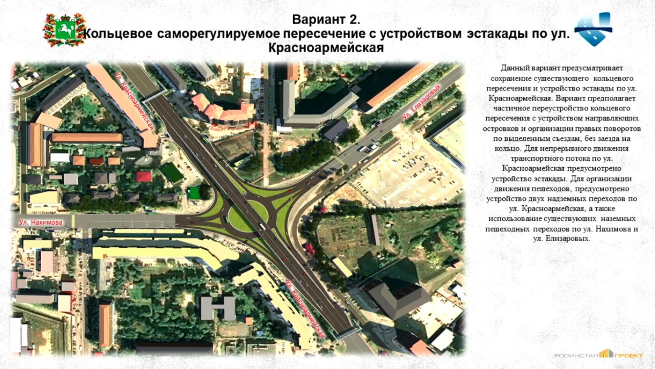 Второй вариант — сохранение кольцевого пересечения с устройством эстакады по улице Красноармейской. На кольце остается весь транзит улицы Нахимова и Елизаровых. Правоповоротные съезды выделены и левоповоротные съезды расходятся через кольцо. Пешеходная сеть сохранена с учетом наземных пешеходных переходов и надземного перехода по Красноармейской.