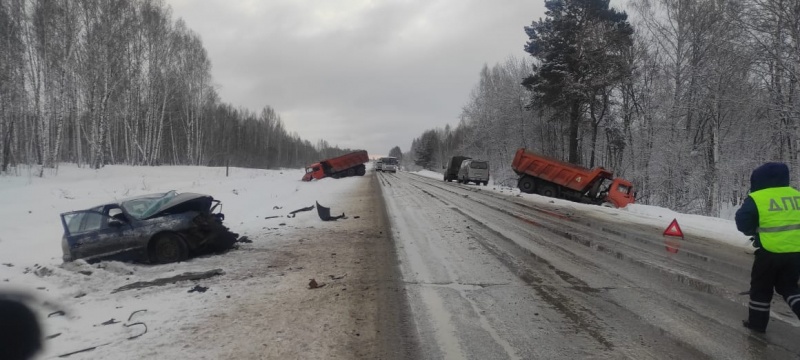 Лобовое ДТП с участием двух КамАЗов и Toyota произошло на томской трассе