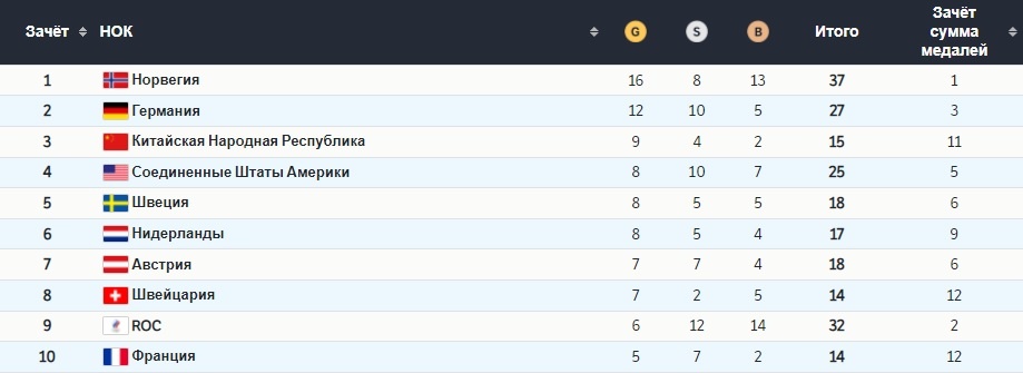 Медальный зачет Олимпийских игр-2022 досрочно выиграли норвежцы, завоевавшие 16 золотых, 8 серебряных и 13 бронзовых медалей, в сумме сборная Норвегии взяла 37 медалей Игр.