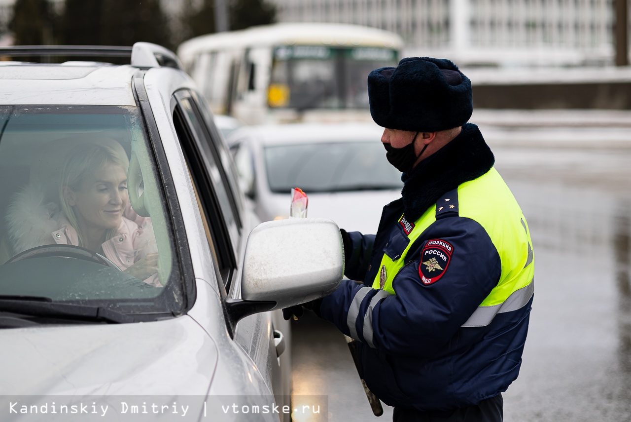 Сотрудники Госавтоинспекции в преддверии Международного женского дня провели в Томске акцию — инспекторы останавливали на дорогах машины с женщинами за рулем и вместо обычной проверки документов вручали им цветы и поздравляли с 8 Марта.