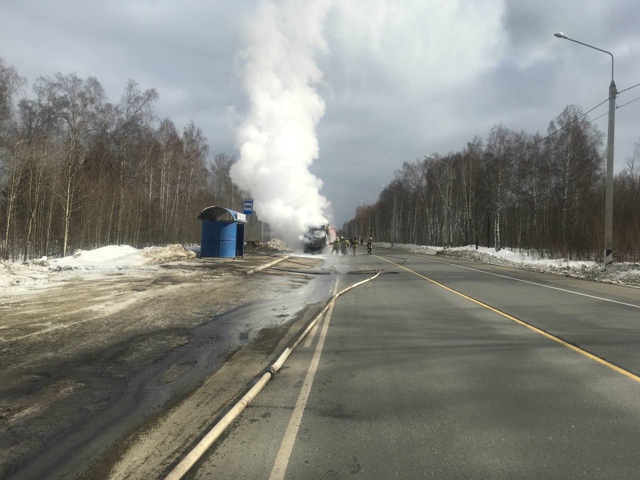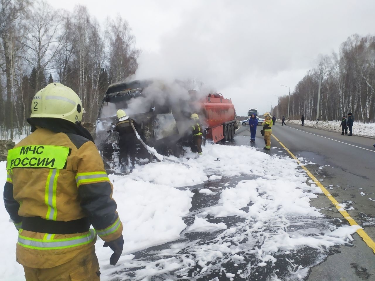 В региональном управлении МЧС сообщили, что информация о возгорании бензовоза на Богашевском тракте в районе поселка Апрель поступила в пожарно-спасательную службу МЧС России в 14:16.