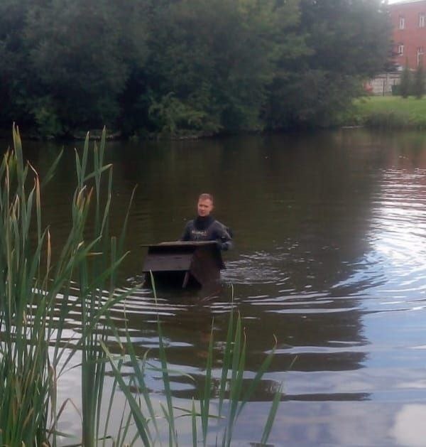 Домики для уток затонули в Университетском озере в Томске во время непогоды. По просьбе властей аквалангисты ТГУ подняли домики со дна водоема.