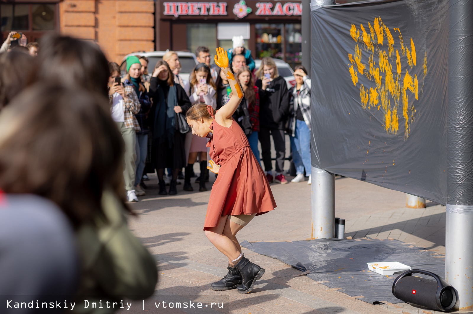 По словам корреспондентов vtomske.ru, открылся Фестиваль «мУкА. Склады искусства» с перфоманса на входе в «Киномир», который подготовили арт-группировка «ТанцТоварищество» и художница Екатерина Пушникова.