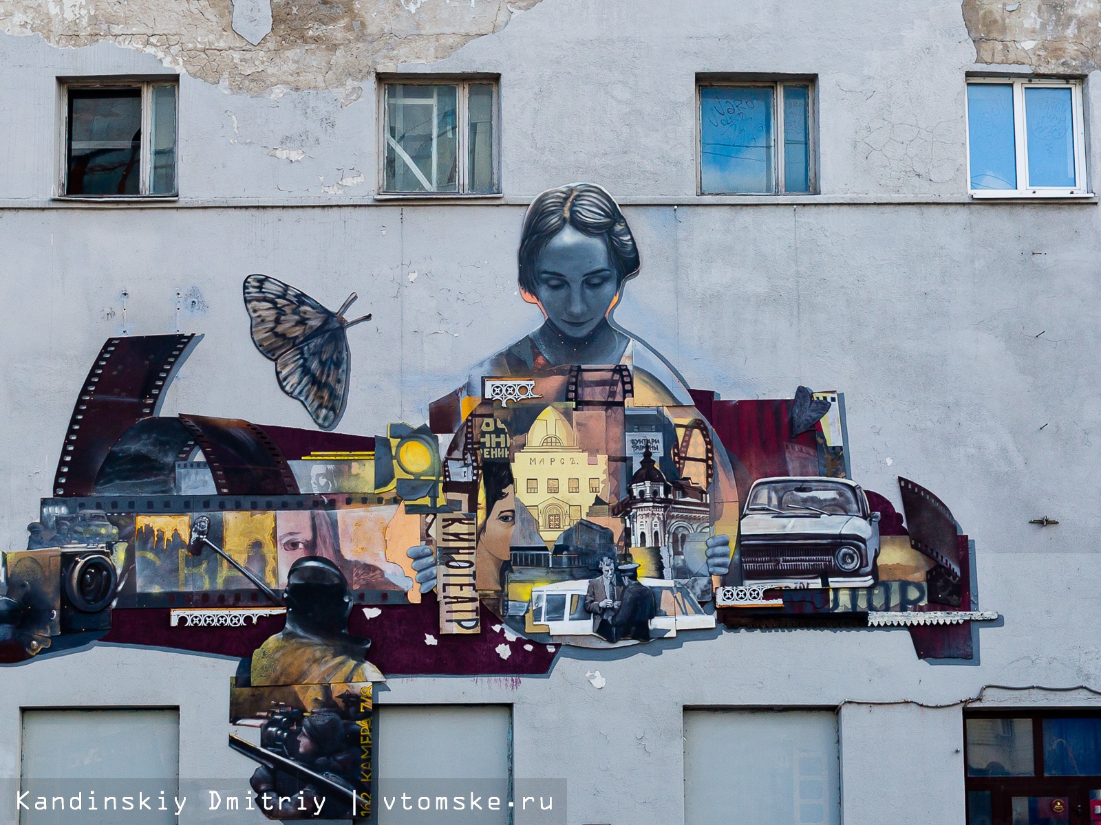 На фасаде «Киномира» томичи могут увидеть баннер, на котором карикатурно изображен герой из вселенной Marvel Капитан Америка. Это работа художника Андрея Люблинского.