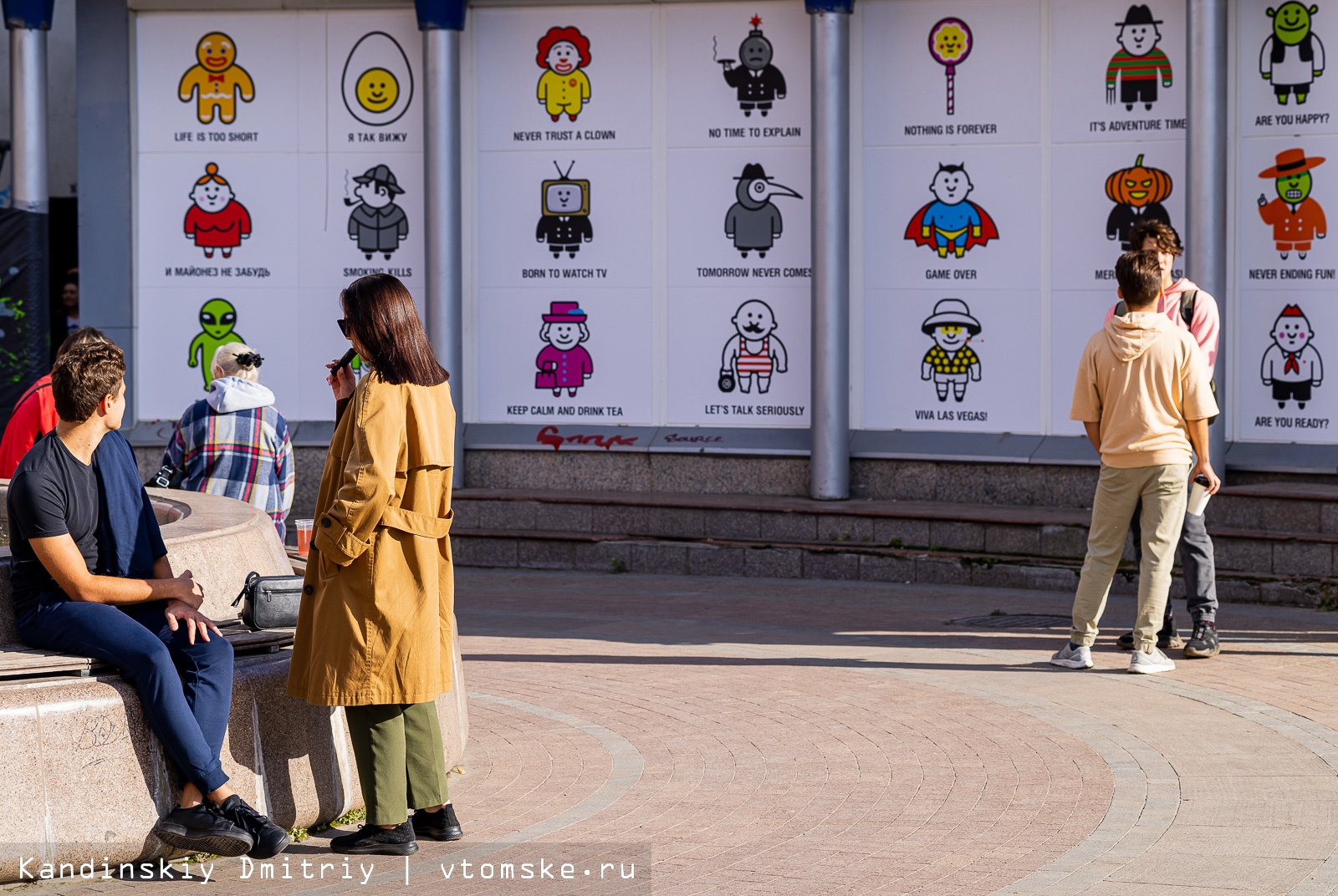 Он же карикатурно нарисовал других знаменитых киногероев с их жизненными лозунгами, которых можно увидеть на здании справа от «Киномира».