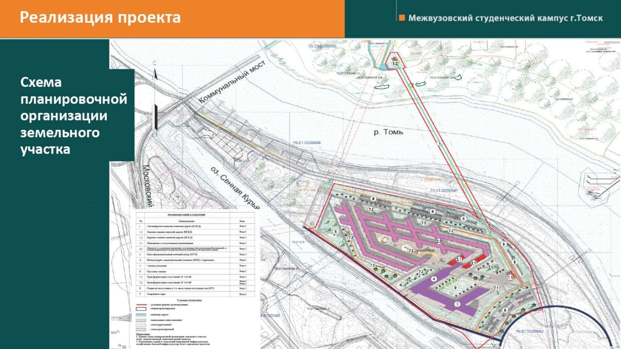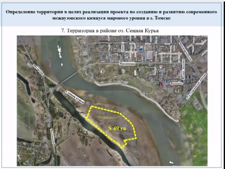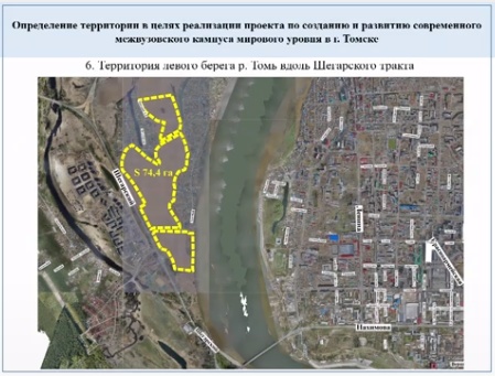 Изначально участок планировали приобрести у ГК «Карьероуправление», его называли наиболее подходящим, но эти планы сорвались. В феврале градсовет Томской области рассмотрел два земельных участка на левом берегу Томи, где может расположиться межвузовский кампус. В итоге власти сообщали, что определили участок на левом берегу Томи, который находится напротив Лагерного сада. По участку начались инженерные и геологические изыскания.
