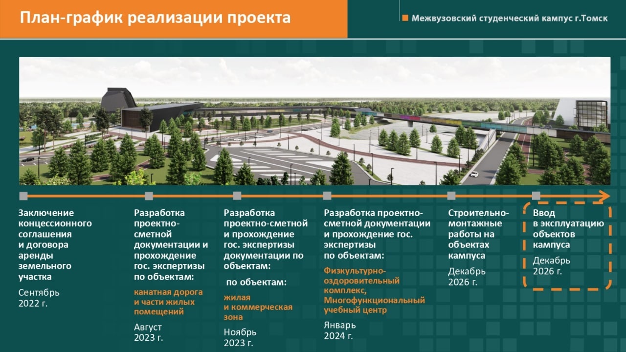 «Существенное замечание в отношении сроков реализации проекта. <...> Сроки, которые нам устанавливает правительство РФ — обязывает нам сдать объект в эксплуатацию в 2026 году, ну, не позднее первого квартала 2027 года. Эти сроки связаны с ростом контрольных цифр приема и возрастающей потребностью томских университетов в местах для размещения», — рассказал он.