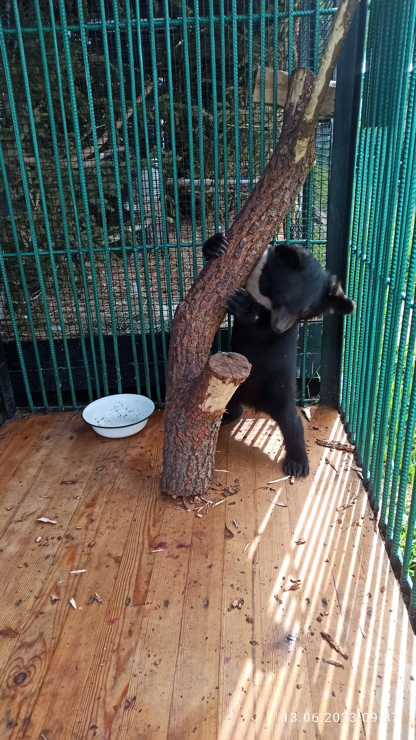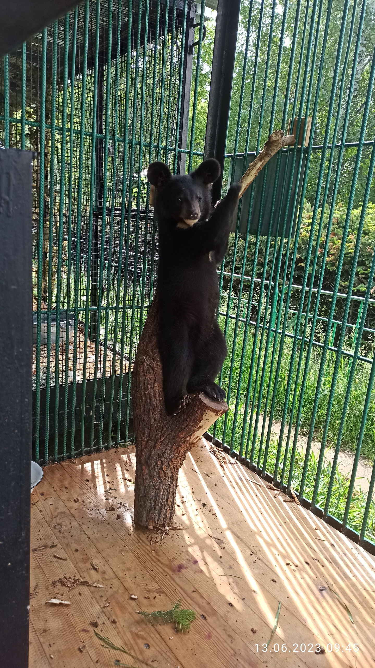 «Первое время она очень стеснялась, старалась спрятаться или залезть в клетке куда-нибудь повыше, что является естественным проявлением страха, ведь в природе, медвежата по сигналу матери забираются высоко на дерево и там пережидают опасность. Но сейчас она чувствует себя вполне комфортно», — рассказали в учреждении.